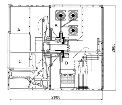 | Dimensiones (WxDxH): 1400x2800x2600 | Diagrama esquemático de la estructura del conmutador A. sala de instrumentos de relé B sala de bus C sala de interruptores D cable |